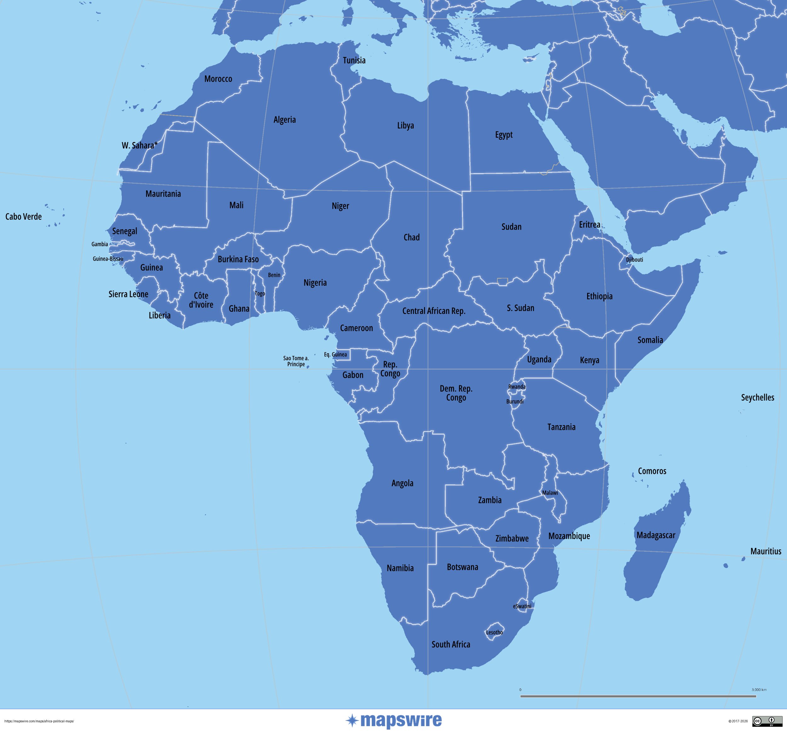 Download three maps of Africa for free on this page. The maps are provided under a Creative Commons (CC-BY 4.0) license. Use the "Download" button to get the largest image available.